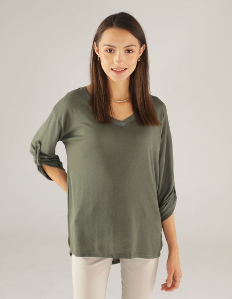 Bluzka wykonana z cienkiej dzianiny. – dekolt w serek– długie rękawy z możliwością podpięcia– wydłużony tył– luźny fason Wymiary dla rozmiaru uniwersalnego: Długość całkowita (przód/tył): 67/77 cm Szerokość w biuście: 60 cm Modelka ma 176 cm wzrostu i prezentuje rozmiar uniwersalny. Podane wymiary są mierzone na płasko i mają charakter orientacyjny.