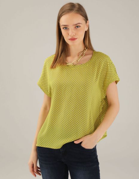 Żółta bluzka wykonana z cienkiej tkaniny. – zaokrąglony dekolt – krótkie rękawy – prosty fason – całość w subtelny, geometryczny wzór Wymiary bluzki [cm]: &l