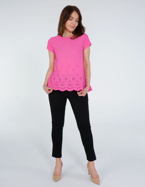 Bluzka wykonana z delikatnej w dotyku bawełny. – zaokrąglony dekolt– krótkie rękawy– ażurowy wzór– zakończona subtelną falbaną Wymiary Długość całkowita: 61 cm Szerokość w biuście: 46 cm Modelka ma 175 cm wzrostu i prezentuje rozmiar S. Podane wymiary mają charakter orientacyjny.