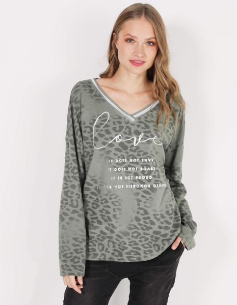 Bluzka wykonana z wysokogatunkowej bawełny z domieszką elastanu. Model z dekoltem w trójkąt, obszyty listwą. Dodatkowo długie rękawy. W przedniej części połyskujący nadruk. Całość w modnym wzorze. Luźny fason swobodnie układa się na sylwetce. Wymiary Długość całkowita: 71 cm Szerokość w biuście: 60 cm Modelka ma 174 cm wzrostu i prezentuje rozmiar uniwersalny. Podane wymiary […]