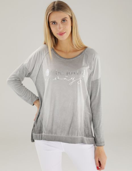 Bluzka wykonana z łączonych materiałów, ozdobiona srebrnym nadrukiem. – zaokrąglony dekolt – obniżona linia przeszycia ramion – długie rękawy – całość nierównomiernie cieniowana – wydłużony tył – przeszycia ze srebrną nicią Wymiary bluzki [cm]: S M L