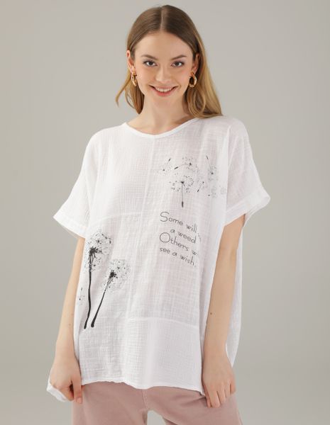Bluzka wykonana z przyjemnej w dotyku bawełny o różnej strukturze. – dekolt zaokrąglony – krótkie rękawy – z przodu nadruk i cyrkonie – poziome i pionowe przeszycia – tył gładki – swobodny krój Wymiary bluzki [cm]: S M L Długość całkowita: 72 74 75 Szerokość w biuście: 68 70 73 Modelka ma 175 cm […]