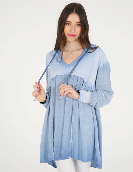Zwiewna bluzka wykonana z łączenia materiałów. – funkcjonalny kaptur z troczkami– dekolt w kształcie litery V– rękawy zakończone gładkim ściągaczem– ozdobne przeszycia nicią w kolorze srebrnym– całość nierównomiernie barwiona Wymiary Długość całkowita: 77 cm Szerokość w biuście: 53 cm Modelka ma 174 cm wzrostu i prezentuje rozmiar S. Podane wymiary mają charakter orientacyjny.