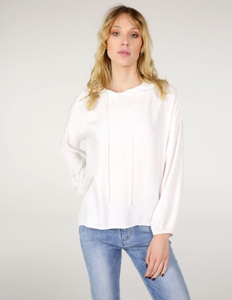 Bluzka wykonana z przyjemnej w dotyku wiskozy. Model z funkcjonalnym kapturem zakończonym troczkami. Długie rękawy o obniżonej linii przeszycia zakończone wąskim ściągaczem z gumą. Tył bluzki zaokrąglony i lekko przedłużony. Luźny fason swobodnie układa się na sylwetce. Modelka ma 180 cm wzrostu i prezentuje rozmiar S.Długość pośrodku tyłu dla rozmiaru S wynosi około 65 cm, […]
