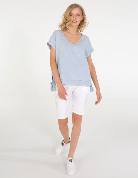 Bluzka o luźnym fasonie. – dekolt w serek surowo wykończony– krótki rękaw zakończony listwą– z przodu metaliczny srebrny nadruk– z tyłu gładka struktura– na dole po bokach wiązanie Wymiary Długość całkowita: 56 cm Modelka ma 170 cm wzrostu i prezentuje rozmiar S. Podane wymiary mają charakter orientacyjny.