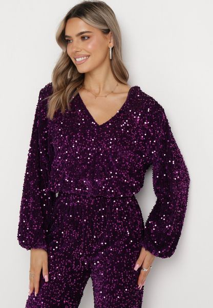 Fioletowa Bluzka Wykończona Ściągaczem na Dole z Cekinami i Trójkątnym Dekoltem Preozja