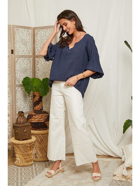 – czysty len- dekolt: V- krój: luźny- look: jednokolorowyWskazówka: Na metkach odzieży tej marki znajdują się rozmiary francuskie. Rozmiarówka została przez nas przeliczona. Podane do wyboru warianty rozmiarów odpowiadają standardowym europejskim rozmiarom konfekcji. Prosimy zapoznać się z zamieszczonym objaśnieniem rozmiarów: