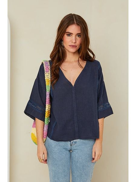 – czysty len- dekolt: V- detale: szydełkowana koronka- krój: prosty- look: jednokolorowy