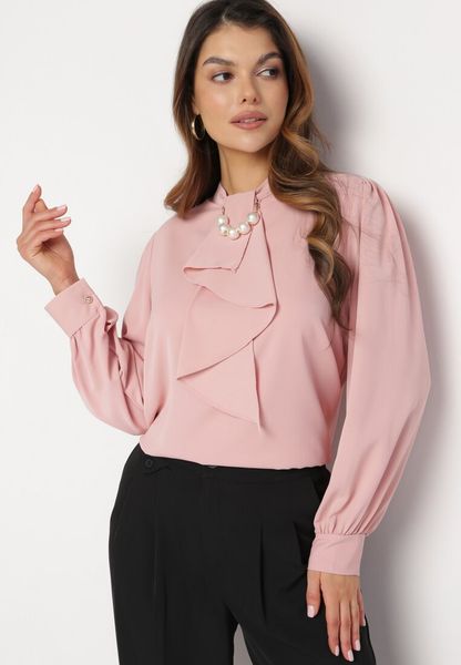 Jasnoróżowa Bluzka z Ozdobnym Krawatem i Perłami Opinua