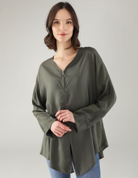 Bluzka wykonana z cienkiej i przyjemnej w dotyku tkaniny. – dekolt w serek regulowany suwakiem– długie, szerokie rękawy zakończone mankietem– zaokrąglony dół z rozporkiem– swobodny fason Wymiary bluzki [cm]: S M L