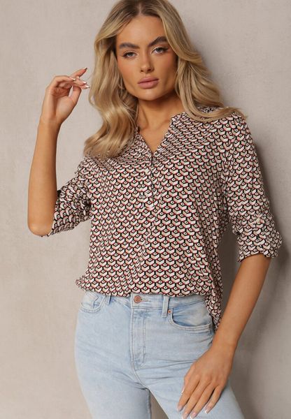 Beżowo-Czarna Wiskozowa Bluzka w Drobny Geometryczny Print z Guzikami Barrela