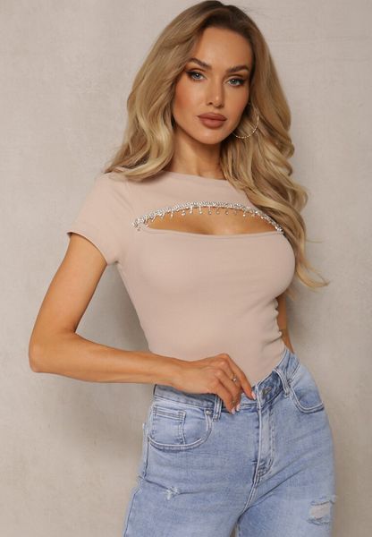Beżowa Bluzka z Bawełny Prążkowana Ozdobiona Cyrkoniami na Wycięciu przy Dekolcie Evandria
