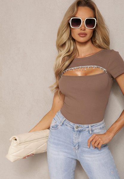 Brązowa Bluzka z Bawełny Prążkowana Ozdobiona Cyrkoniami na Wycięciu przy Dekolcie Evandria