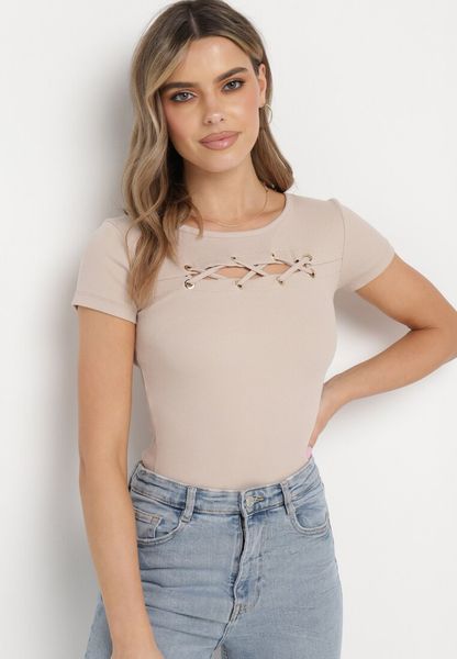 Beżowa Bawełniana Bluzka z Plecionym Zdobieniem przy Dekolcie Elretia