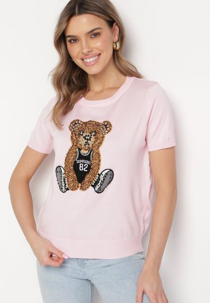 Różowa Wiskozowa Bluzka z Wełnianą Naszywką z Misiem i Cyrkoniami Nyphaim