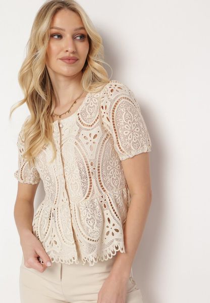 Jasnobeżowa Bluzka Koronkowa z Ozdobnymi Guzikami Ursalinne