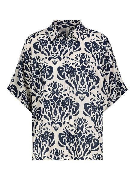 – czysta wiskoza- kołnierz: kent- zapięcie: listwa guzikowa- długość rękawa: 3/4- detale: nakładane rękawki- krój: oversized- wzór: retro