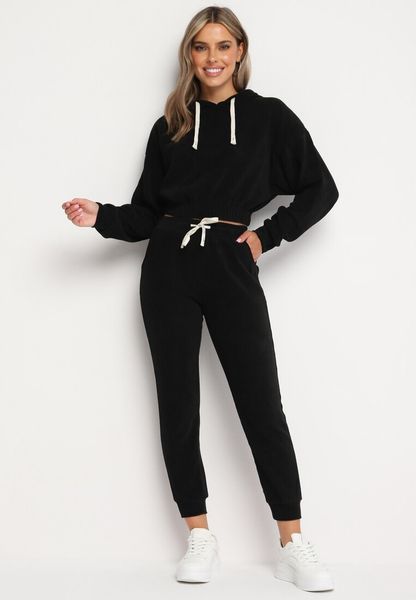 Czarny Komplet Dresowy z Bawełną Krótka Bluza z Kapturem i Spodnie z Gumką w Pasie Gesaria