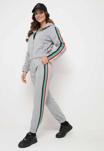 Szary Komplet Dresowy Zdobiony Kolorowym Lampasem Spodnie i Bluza z Kapturem Neviantha
