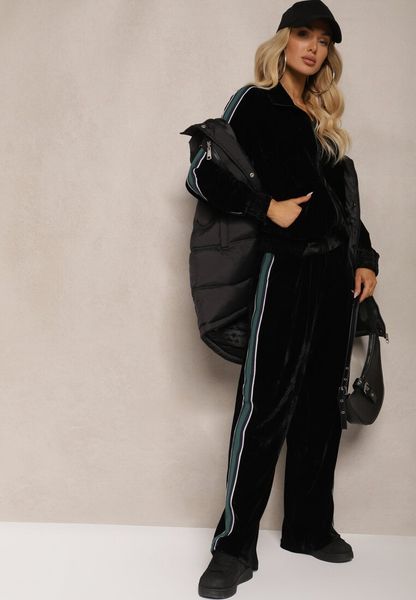 Czarny Welurowy Komplet Dresowy z Bluzą i Spodniami Zdobionymi Lampasem Linvella