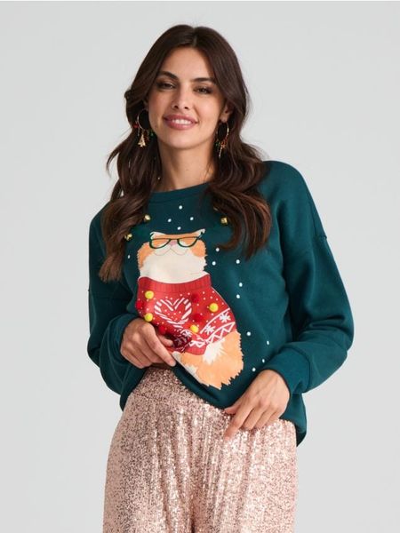 Sinsay – Bluza świąteczna – zielony – motyw świąteczny,nadruk kota,długie rękawy ze ściągaczem,okrągły dekolt,aplikacja 3d