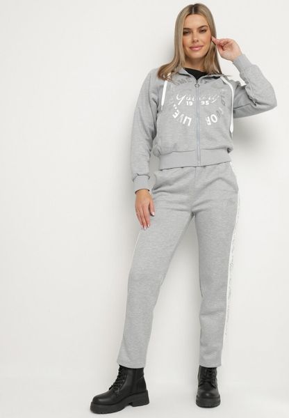 Szary Komplet Dresowy Rozpinana Bluza z Kapturem Spodnie z Napisami Semirwen
