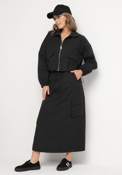 Czarny Komplet z Bawełną Rozpinana Bluza i Spódnica Evariel