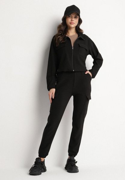 Czarny Komplet Dresowy Rozpinana Bluza z Klapami i Spodnie Typu Cargo Ezvisa