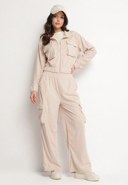Jasnobeżowy Komplet Dresowy w Stylu Cargo Bluza ze Stójką i Szerokie Spodnie Arritarra