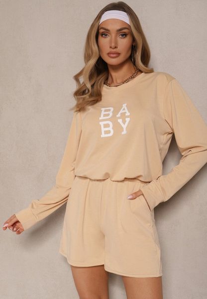 Beżowy Komplet Dresowy 2-Częściowy Bluza Krótsza i Luźne Spodenki Szorty Frania
