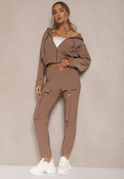 Brązowy Komplet Dresowy Utility Bluza Rozpinana i Spodnie z Kieszeniami Telinoria