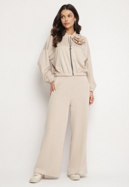 Ciemnobeżowy Komplet Dresowy z Wiskozą Szerokie Spodnie i Bluza ze Stójką i Broszką Redasena