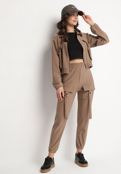 Brązowy Komplet Dresowy Bluza Rozpinana i Spodnie Slim w Stylu Utility Telavienna