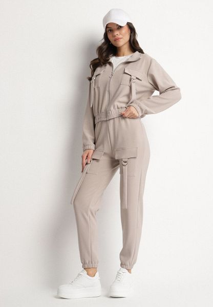 Beżowy Komplet Dresowy Bluza Rozpinana i Spodnie Slim w Stylu Utility Telavienna
