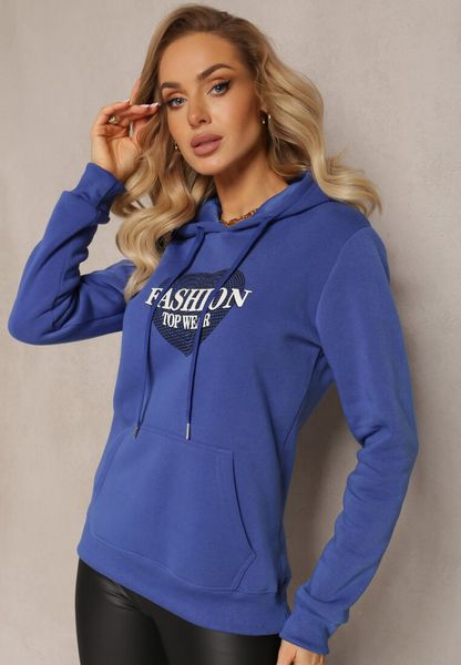 Niebieska Bluza Kangurka Ocieplona Polarem z Ozdobnym Nadrukiem Elili