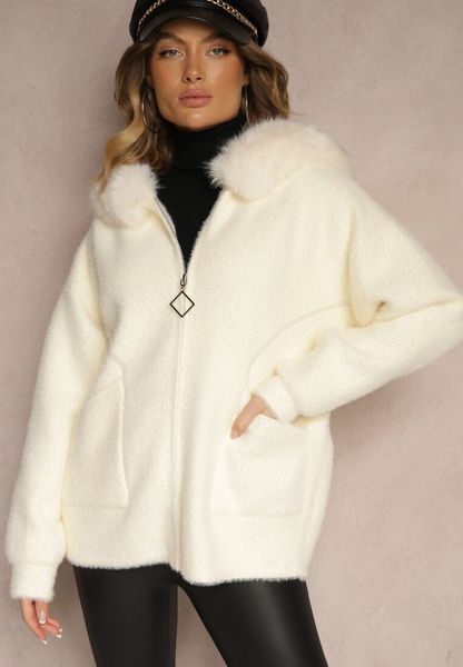 Jasnobeżowa Bluza z Wełną z Kapturem i Kieszeniami Ozdobiona Futerkiem Siliti