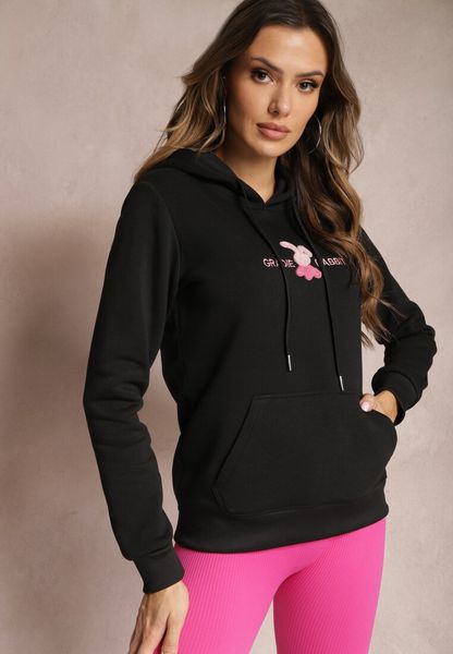 Czarna Ocieplona Bluza z Kapturem Ozdobiona Naszywką i Napisem Eirellia