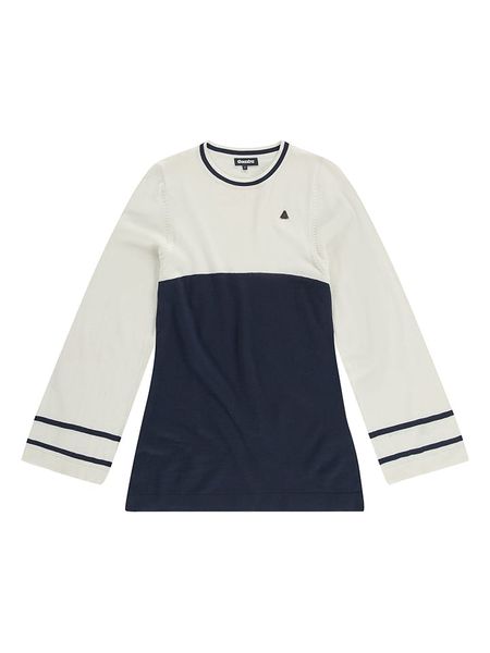 – z dodatkiem wełny- dekolt: okrągły- detale: haft z logo- krój: luźny- wzór: colour blocking