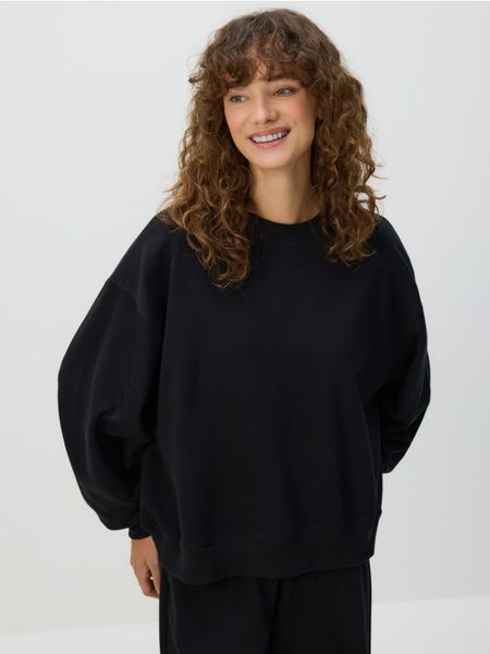 Bluza o swobodnym fasonie, wykonana z gładkiej, bawełnianej dzianiny.