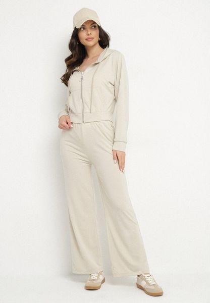 Beżowy Komplet Dresowy Bluza z Kapturem Rozpinana i Szerokie Spodnie Avesmira