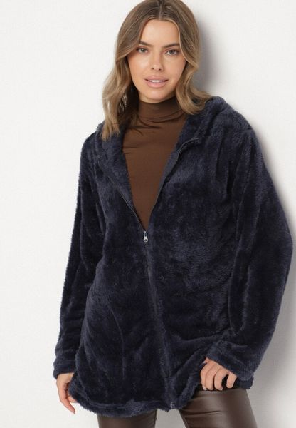 Granatowa Futerkowa Bluza z Kapturem i Suwakiem Sinatila