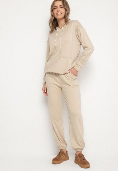 Beżowy Komplet Dresowy Bluza z Kapturem i Kangurową Kieszenią i Spodnie Liriela
