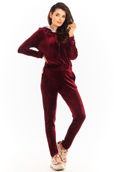 Krótka Welurowa Bluza na Suwak z Kapturem – Bordowa