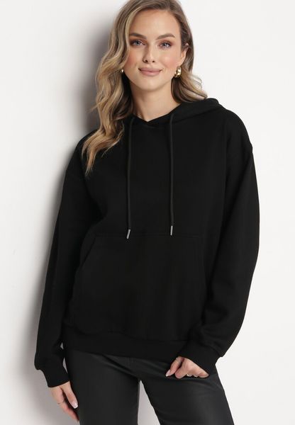 Czarna Bluza Kangurka z Kapturem i Szeroką Kieszenią Rihea