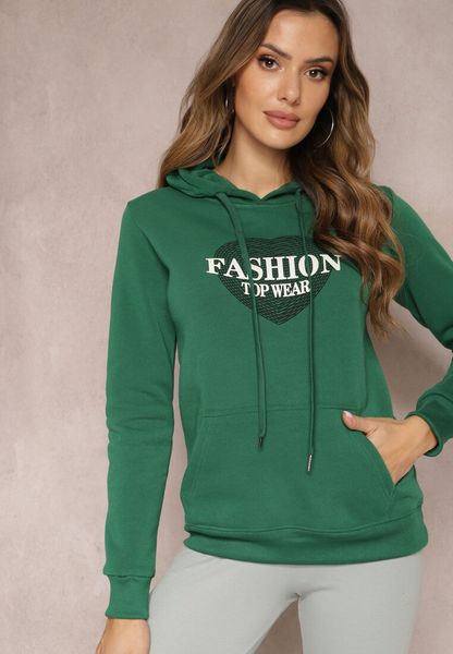 Zielona Bluza Kangurka Ocieplona Polarem z Ozdobnym Nadrukiem Elili