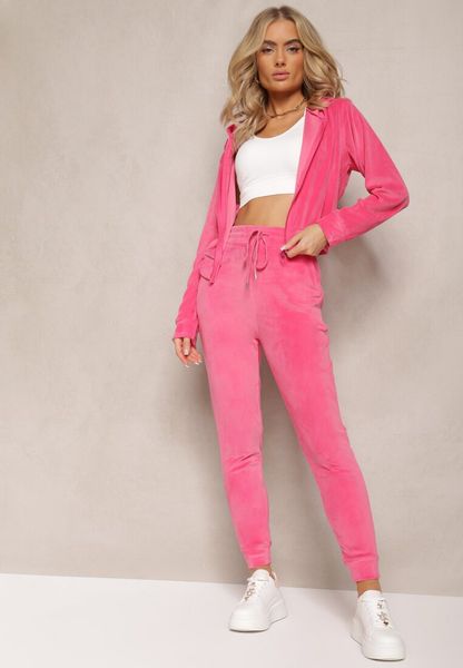 Fuksjowy Dresowy Komplet z Weluru Spodnie i Bluza z Kapturem na Suwak Styrena