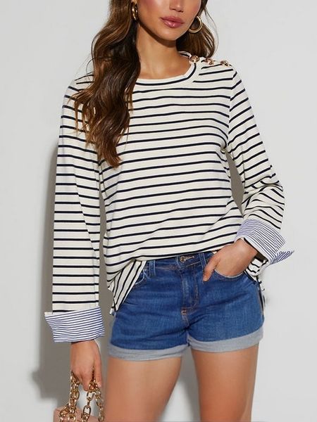 – dekolt: okrągły- detale: ozdobne guziki- krój: luźny- wzór: paski
