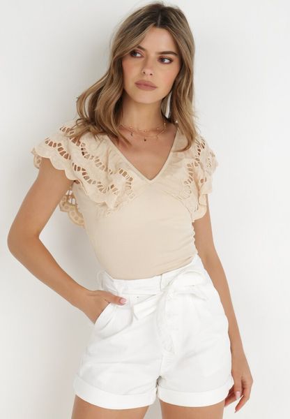 Body Artadina z mocno wyciętym dołem. Zapinane na zatrzaski w dolnej części. wykonane z haftowanej dzianiny. Góra z trójkątnym dekoltem (przód i tył). Krótki rękaw tworzą kaskadowe falbanki, co nadaje fasonowi eleganckiego stylu. Elastyczna dzianina z przewaga bawełny (bawełna 95%). Body z dekoracyjnym rękawem wykorzystasz w stylizacji z elegancką spódnicą i butami na obcasie.