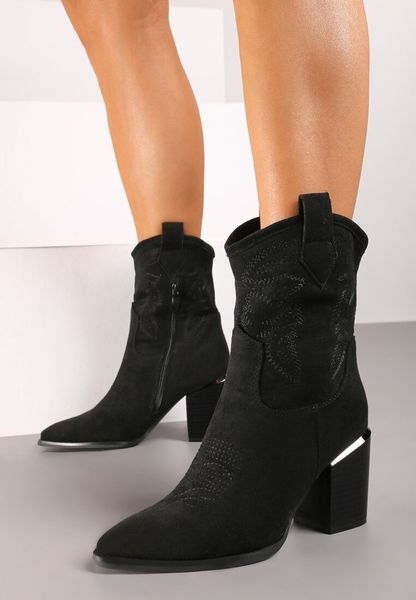 Czarne Botki Kowbojki na Obcasie Ozdobione Haftem Mevael