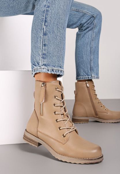 Beżowe Sznurowane Botki Workery na Płaskiej Podeszwie Ozdobione Suwakiem Tarinda